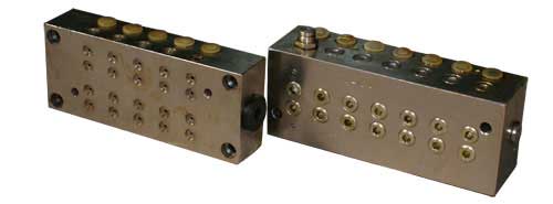 WVK,WVM 递进分配器为整体递进式,其给油口在左右两侧成对排列,至少为3对。每对给油口之间有通孔,平时由螺塞堵住,卸去该螺塞,闷住其一端口,则油往另一端口加倍给油。同时相邻两给油口可搭桥,接通后油从前给油口经后给油口增加油量排出。这样,经过螺塞通闭和搭桥方法,然后可使分配器组成少至二个给油口供接润滑点。