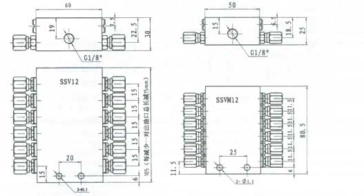 WSSV、WSSVM 递进分配器为整体递进式,它的工作是把压力润滑剂推送经特殊设计排列的各组柱塞,依次递进定量地分到各个油口。本分配器装接于集中润滑系统中,既可由电动润滑泵、也可由脚踏润滑泵或油枪等给予注油。本产品人6、8、10和12个给油口等四种规格,通过两级组合连接,分别可供接2~36至2~144个润滑点。出油口已配置φ6卡套接头。